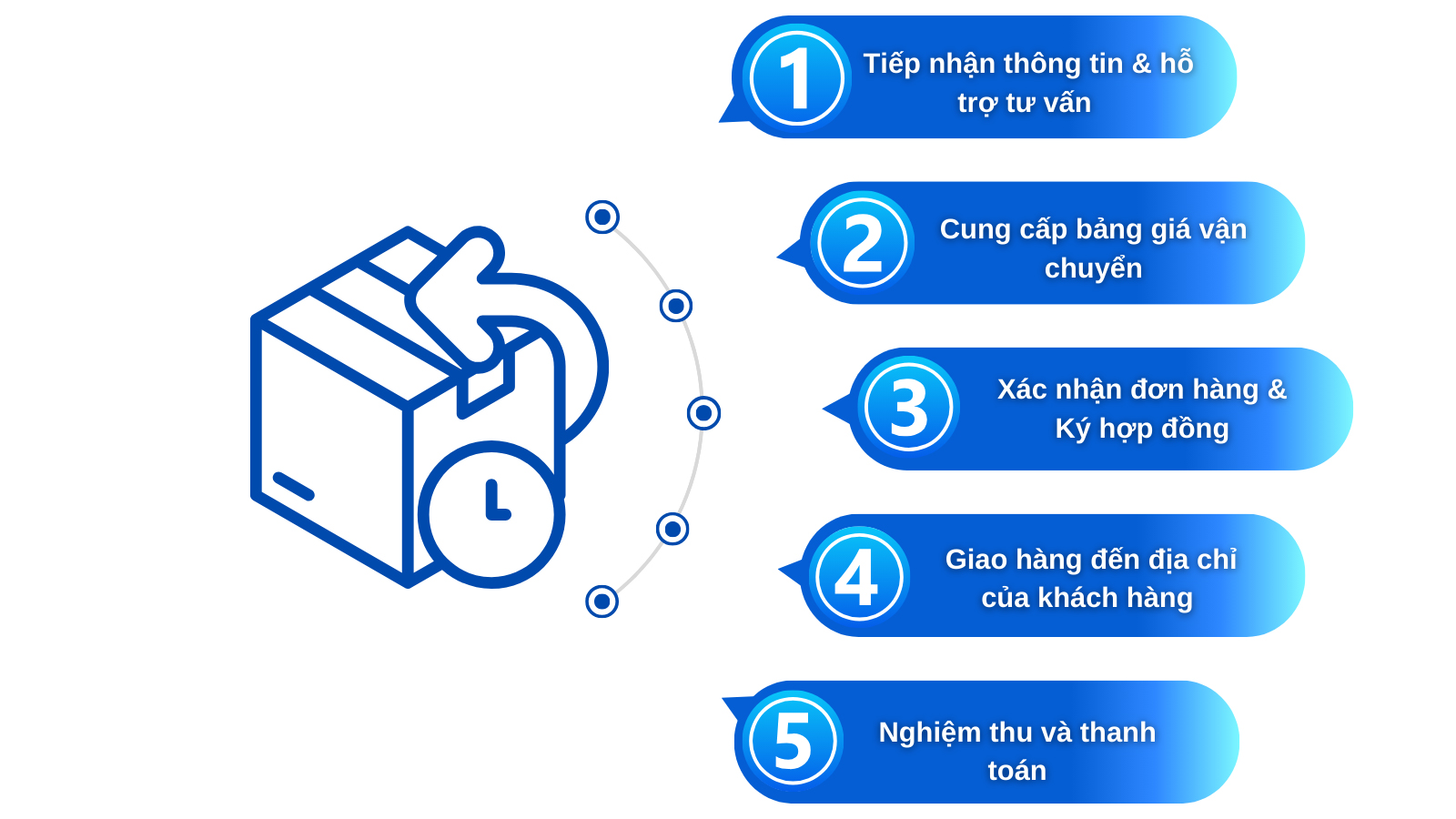 Nhờ vào quy trình chuyên nghiệp, chúng tôi đáp ứng dịch vụ vận chuyển hàng hoá Quận 4 đến khách hàng chỉ sau 5 bước đơn giản dưới đây: